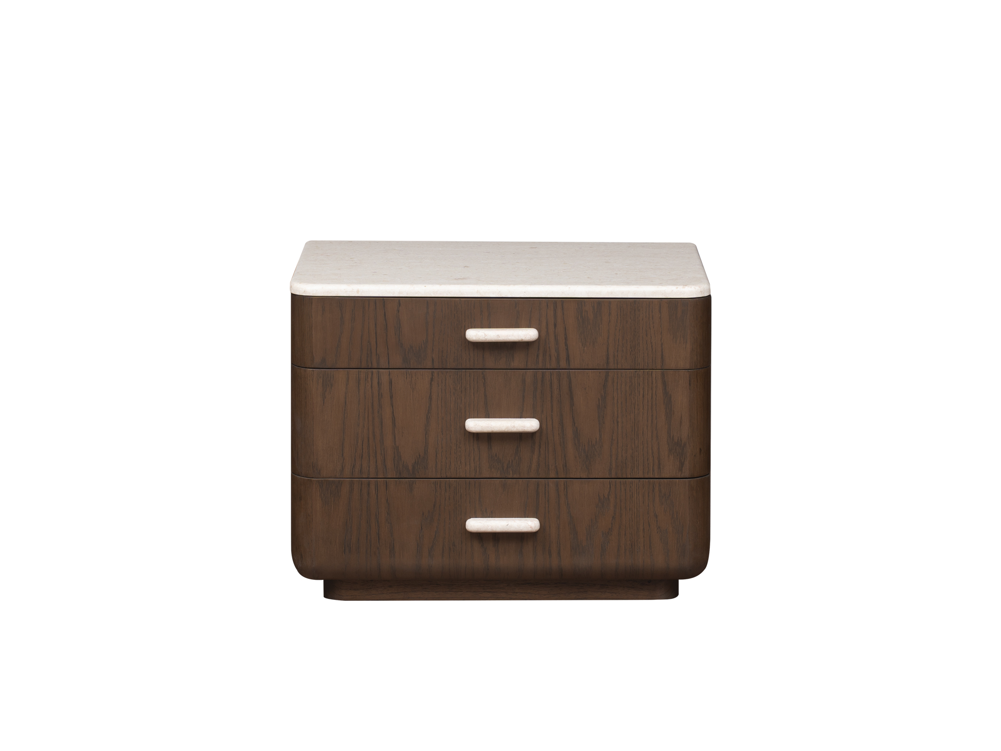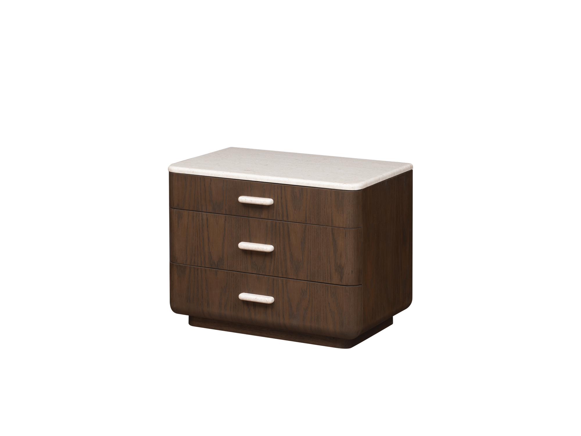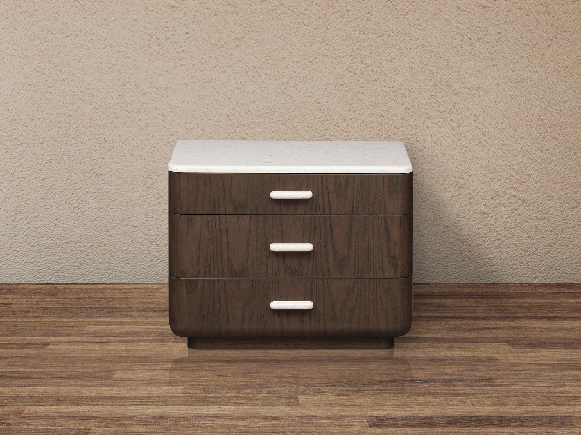 A refined companion to the bed, designed with clean lines and natural wood. The oak veneer finish is elevated by a marble handle that softens its minimal form. Functional yet elegant, it completes the bedroom with quiet romance.