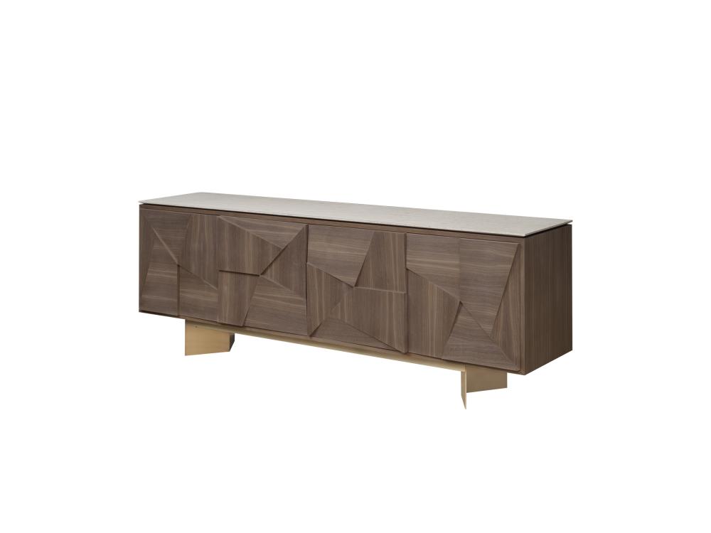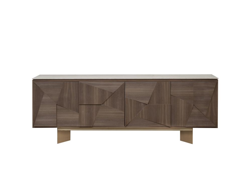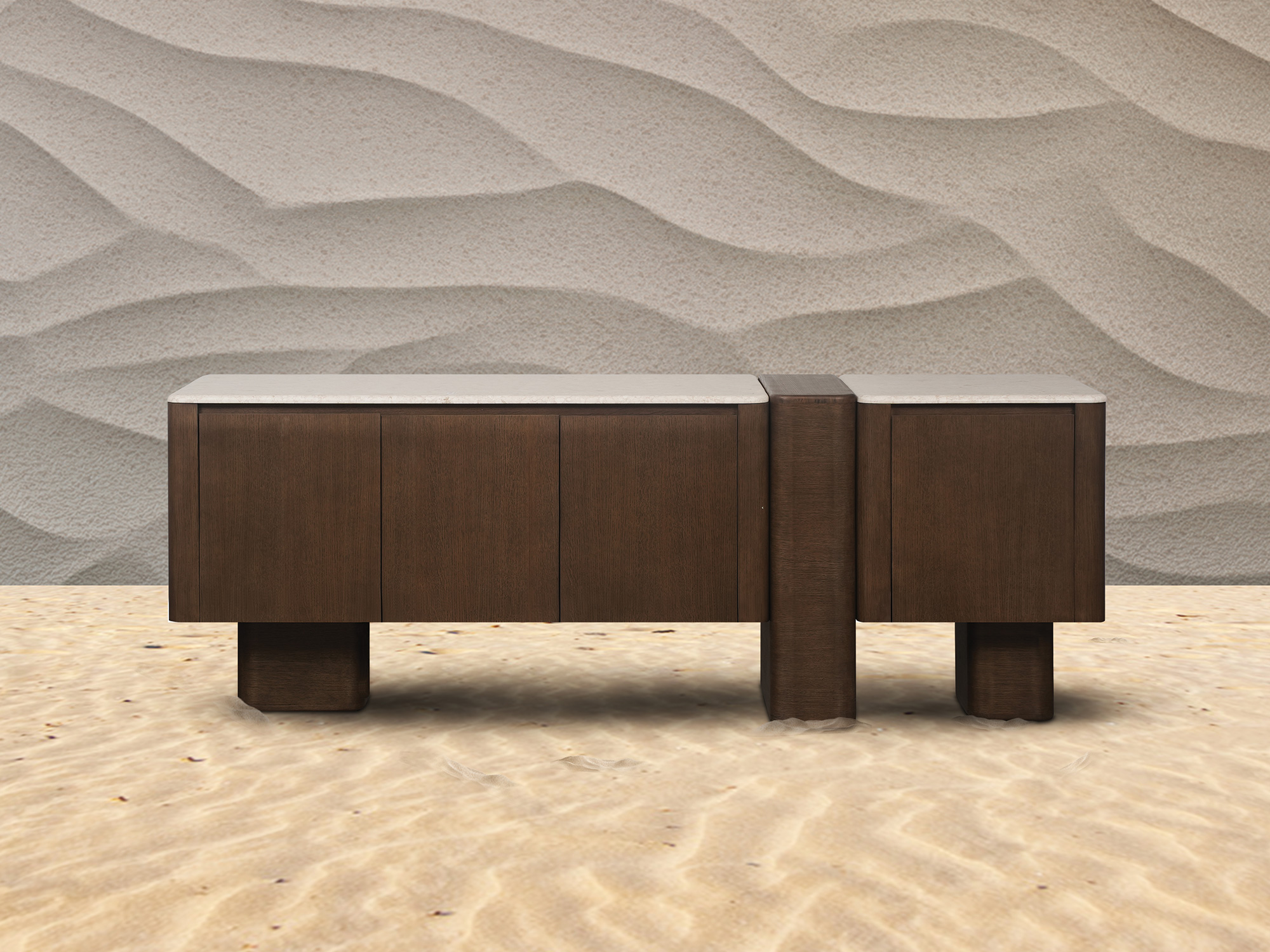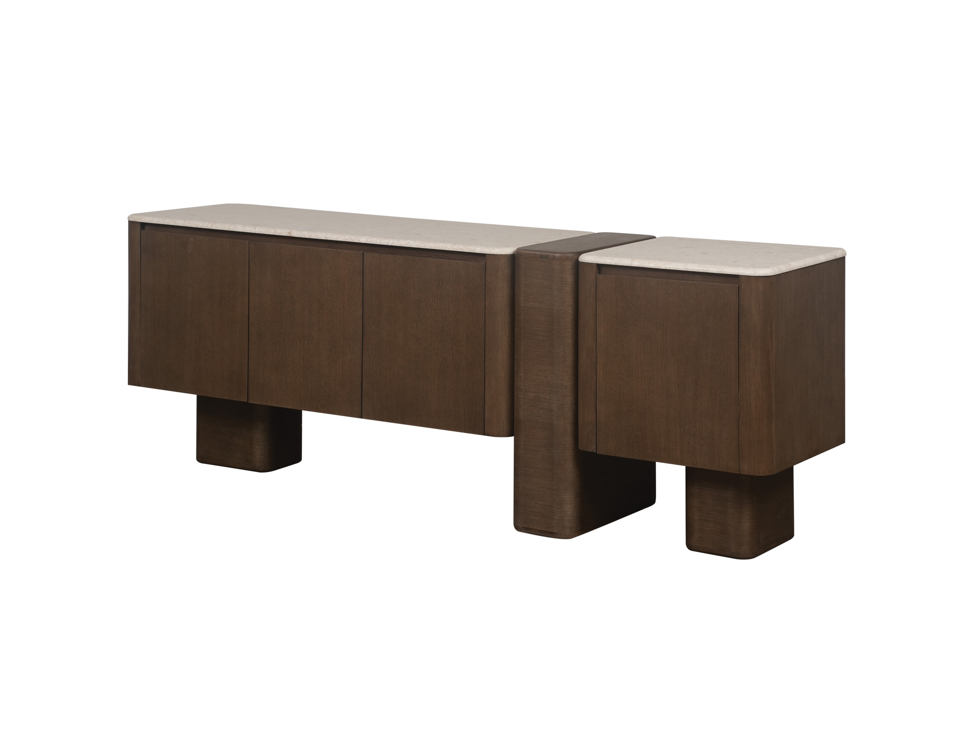 A bold yet graceful design defined by its rounded silhouette and three structural legs. The central leg divides its compartments, introducing rhythm and balance, while the rich dark-brown veneer adds a touch of sophistication. An elegant anchor for storage and display.