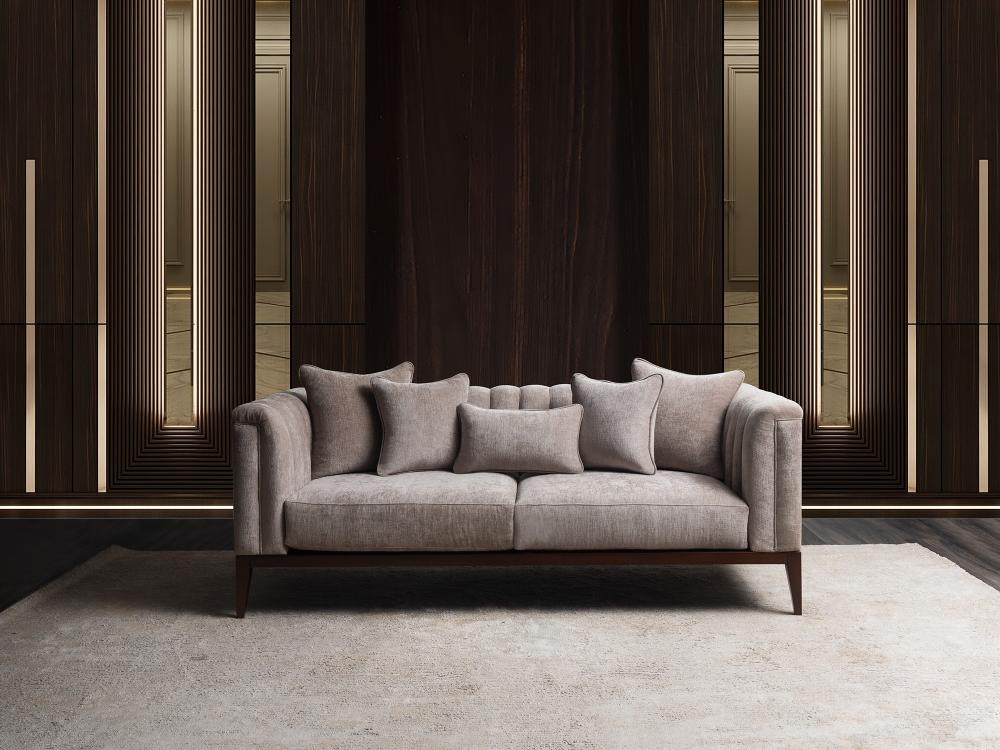 Our Angers Sofa features sumptuous upholstery that gives a next level of luxury. This piece has a curved backrest designed with a narrow channel tufting style. Its fully tight upholstery resting on solid mahogany in a lacquered gold finish defines comfort and the glam of resilient strength.