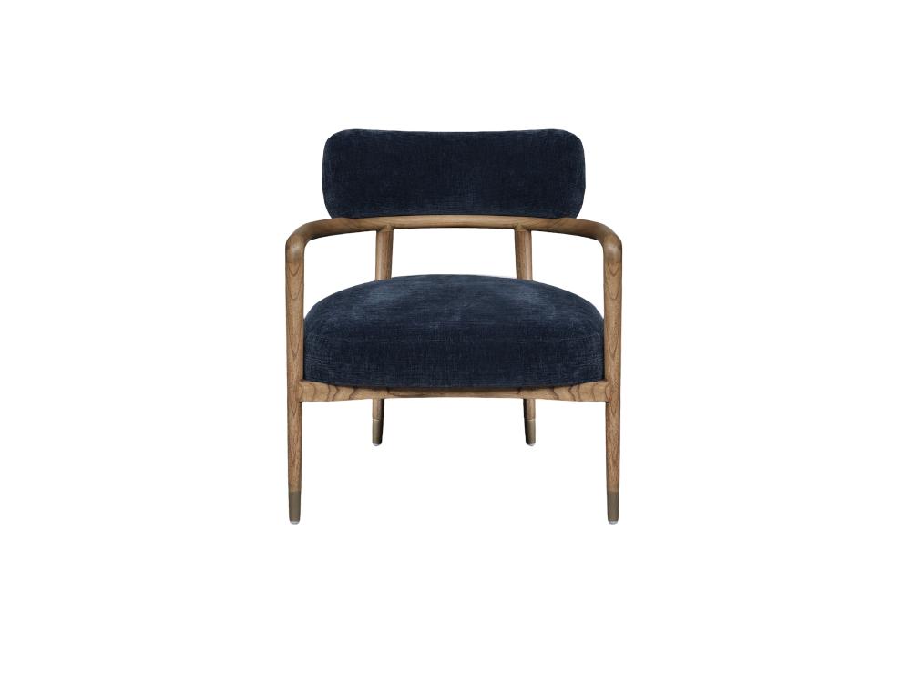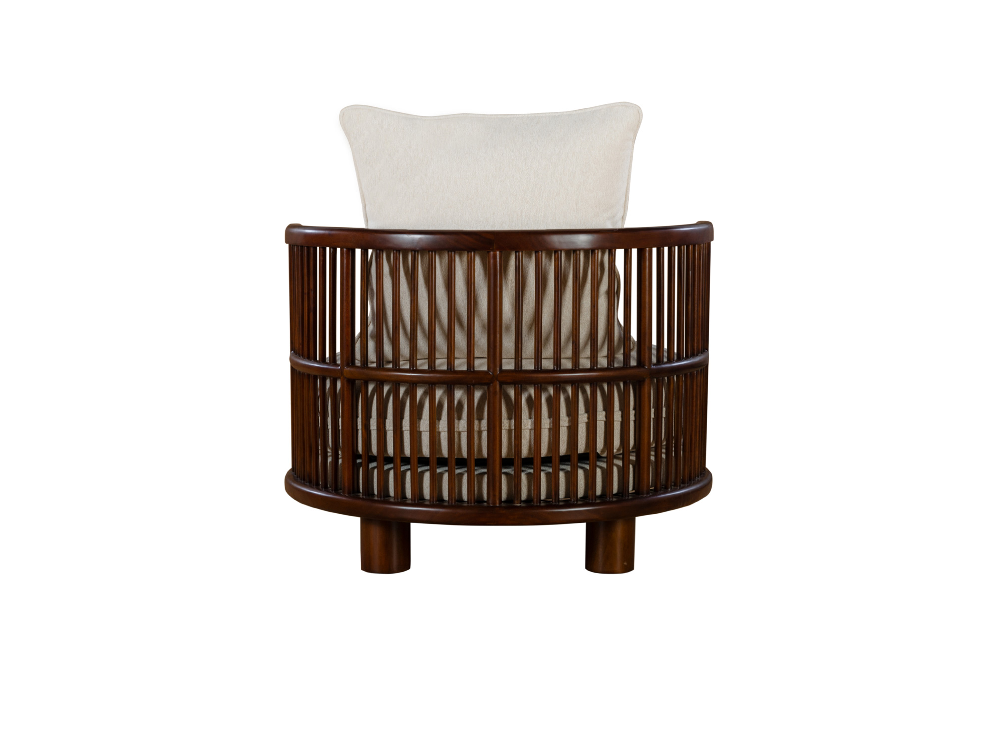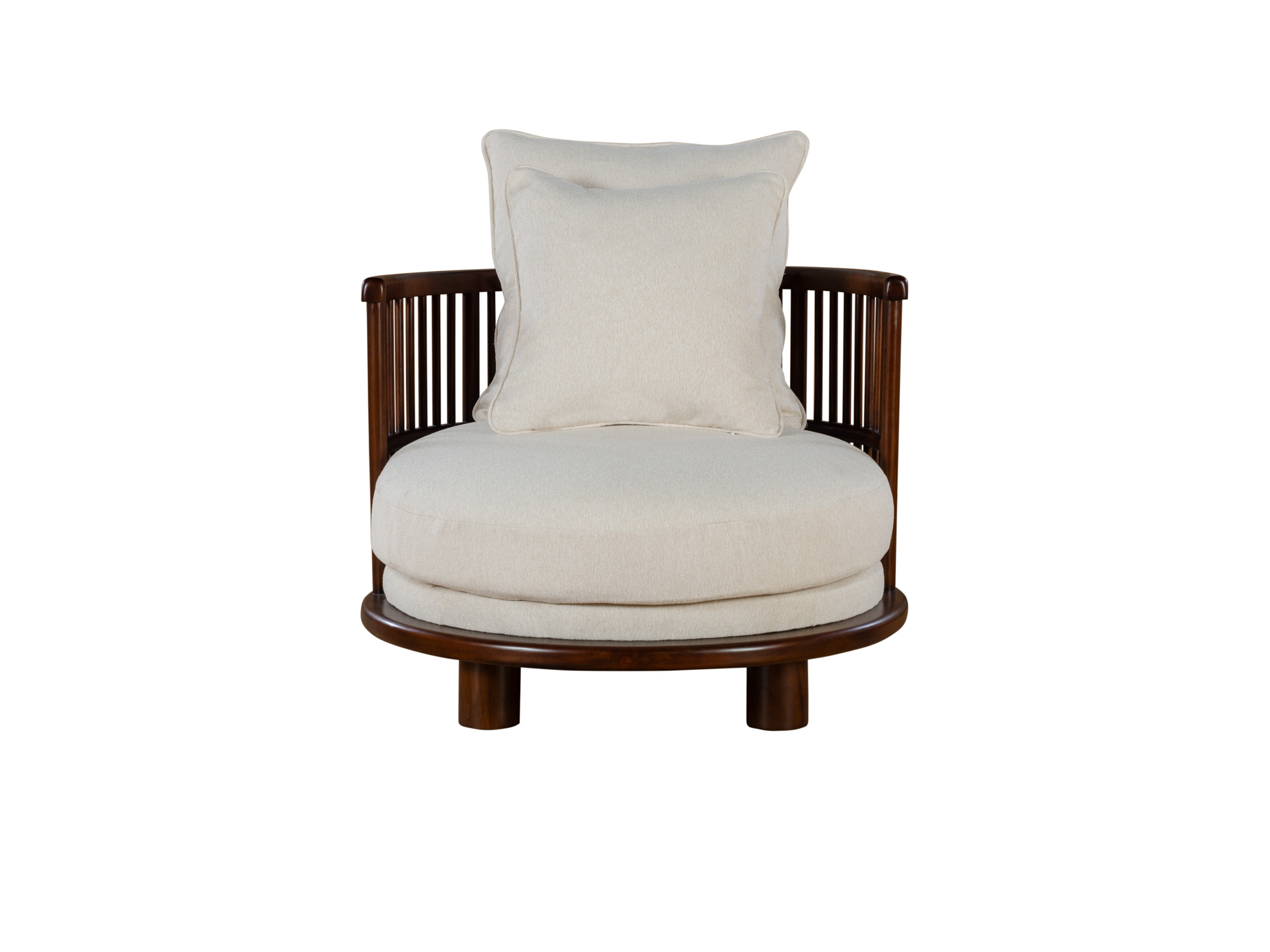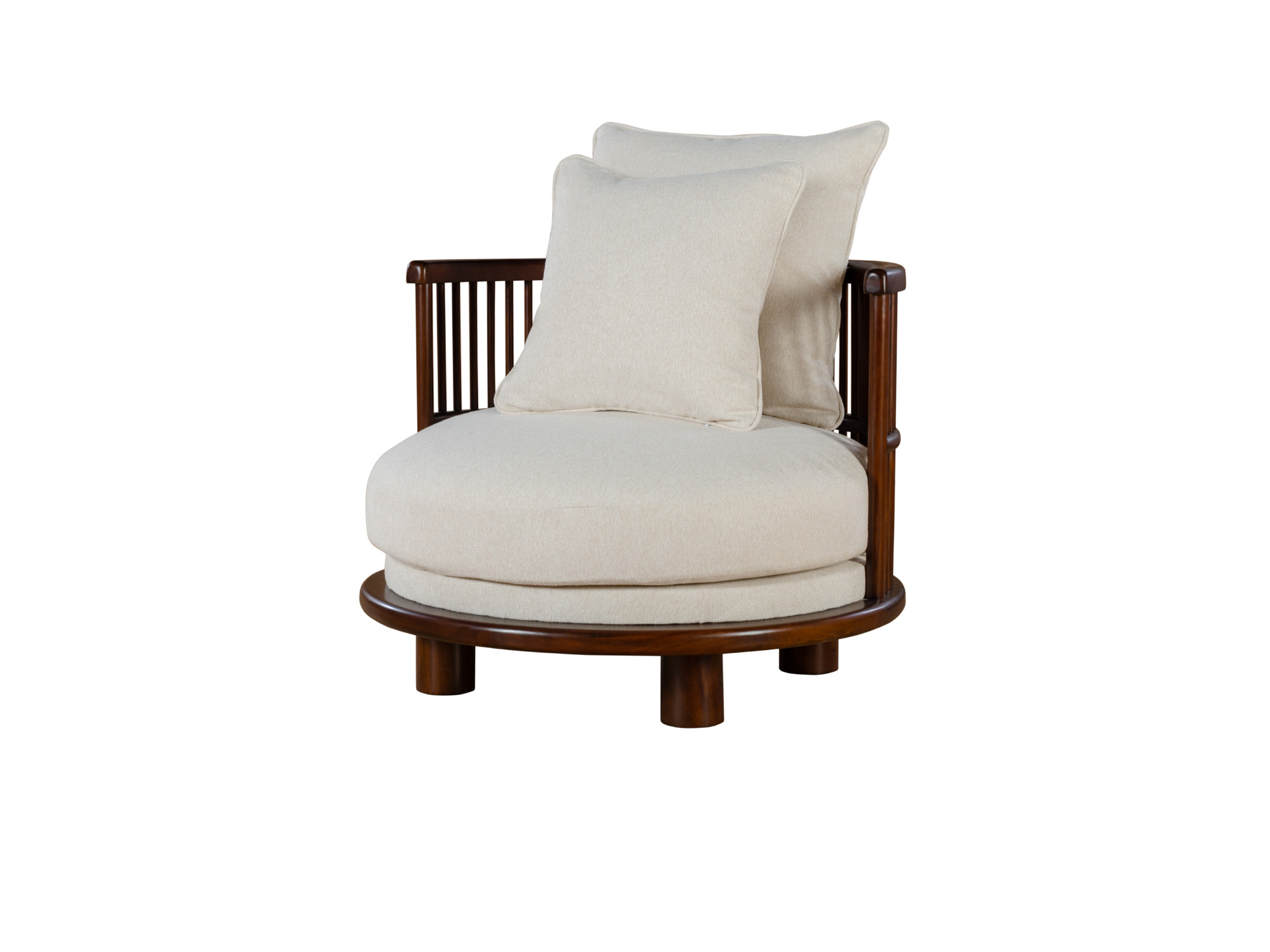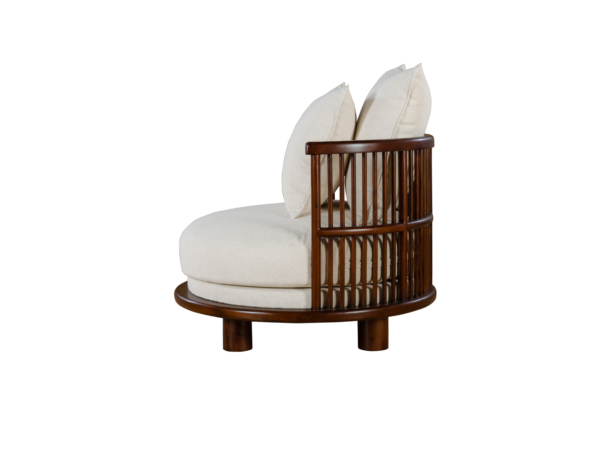 Our Rossignol Accent Chair showcases the fusion of airy slat-style and round seating. This piece features a contoured, slatted back hand-stained in a glossy walnut finish, creating a warm and inviting look. The round seating is generously upholstered in cream fabrics and complemented with two throw pillows, offering a sophisticated leisure sensation.