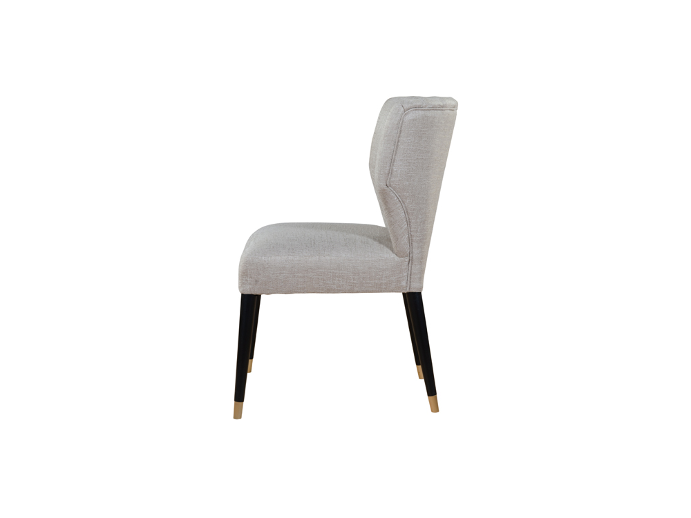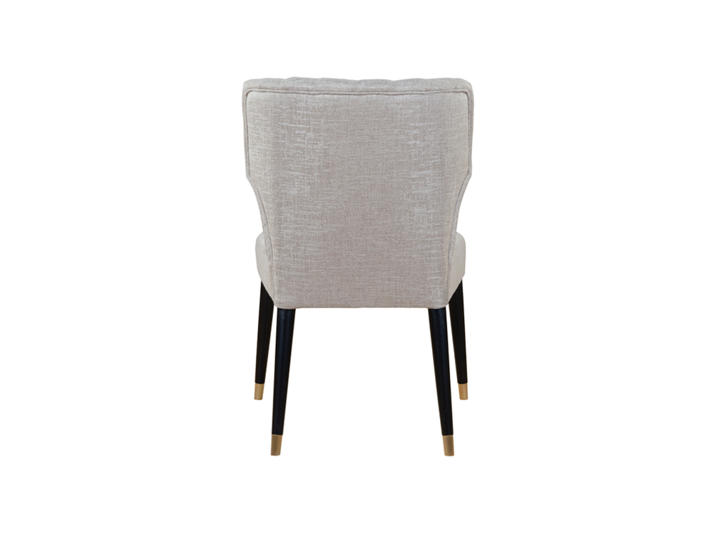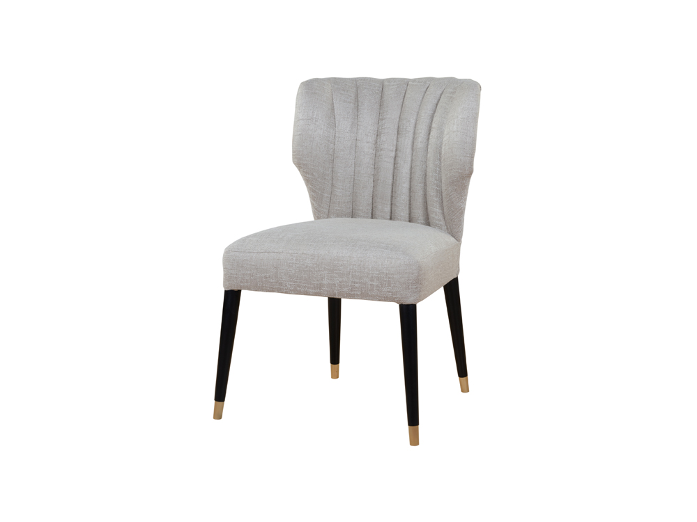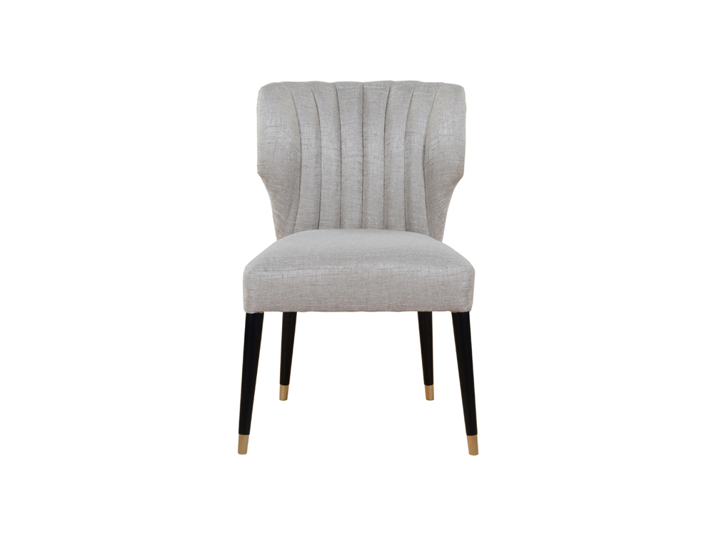 Our Reims Dining Chair blends light luxury with a sleek Mid–century modern style. Featuring an armless silhouette with a pared–down wingback and a tightly contoured backrest with channel tufted detailing, this dining chair is endless reminiscences of Art Deco vibes. The tapered legs are wrapped in a white fabric and capped with brass in a lacquered gold finish, making this collection a stunning accent piece for your dining room.