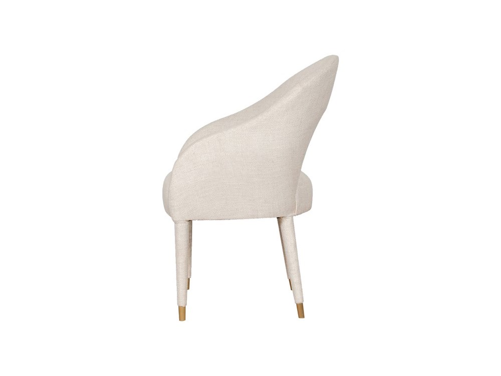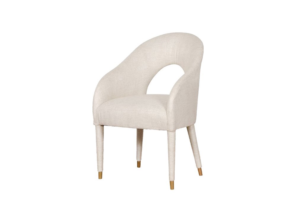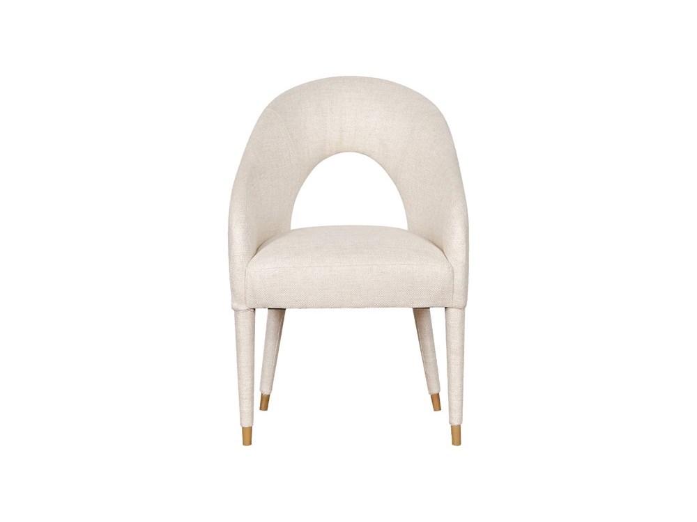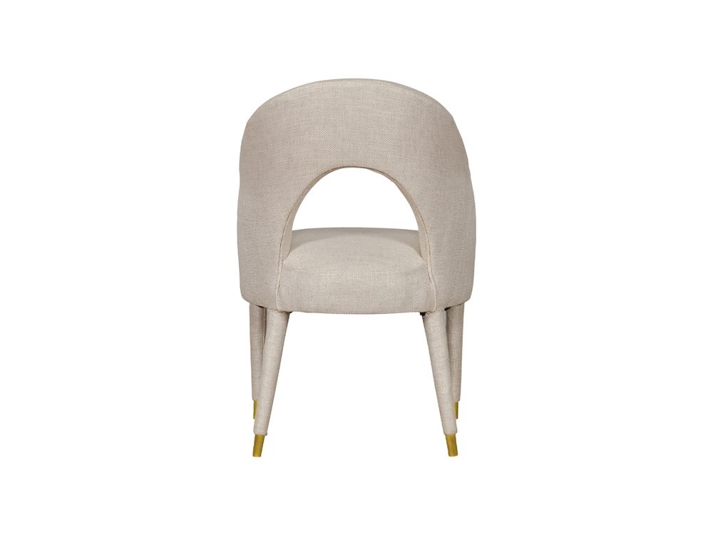 Our Colombes Dining Chair is a modern take on classy design. The open–back backrest lends this piece a unique silhouette, while the plush upholstery in ivory–hued fabrics is soft against the skin and offers laid–back lounging. The round tapered, solid mahogany legs wrapped in ivory fabrics and capped with lacquered–gold brass ferrules further lend this piece an opulent appearance.