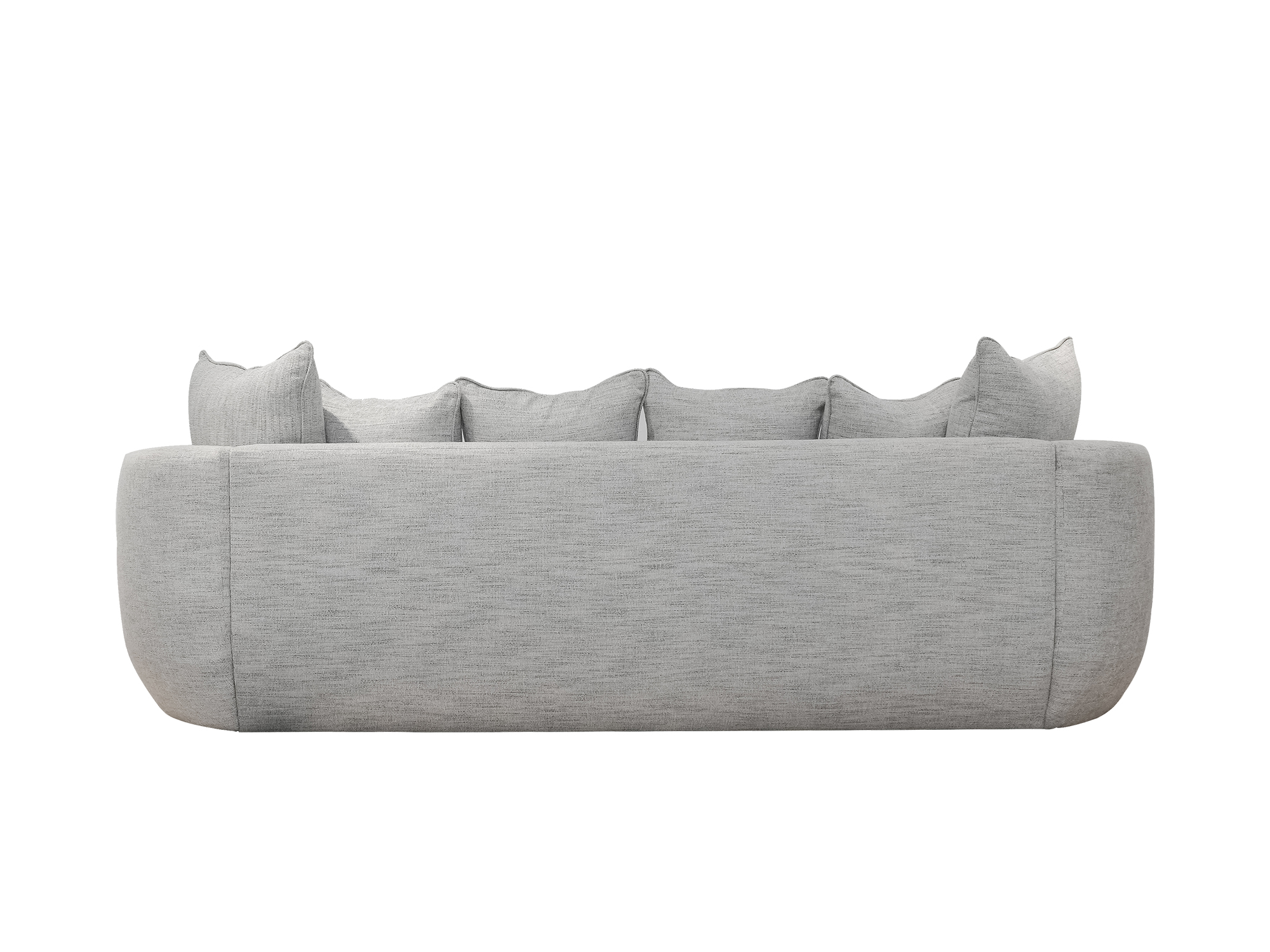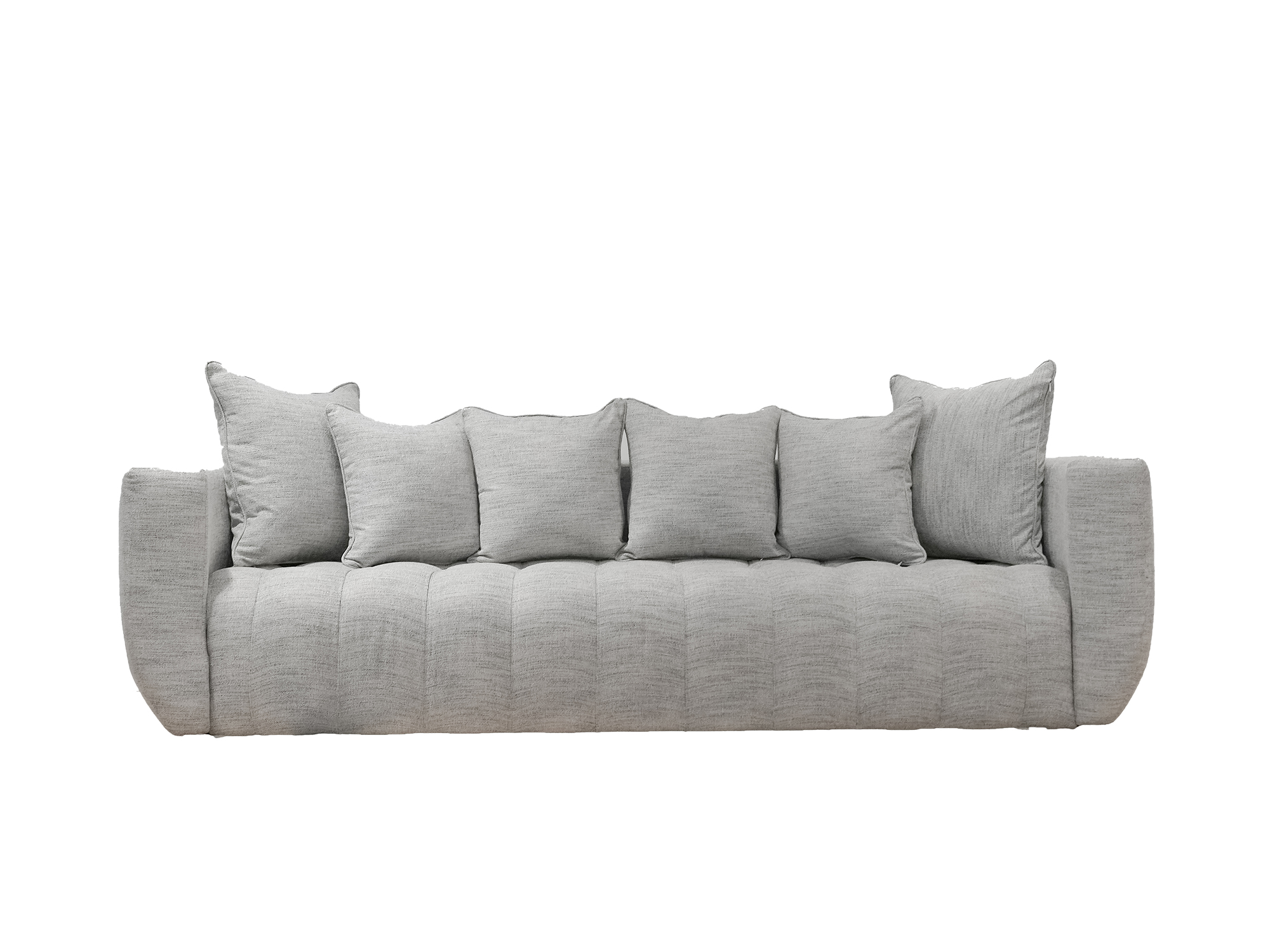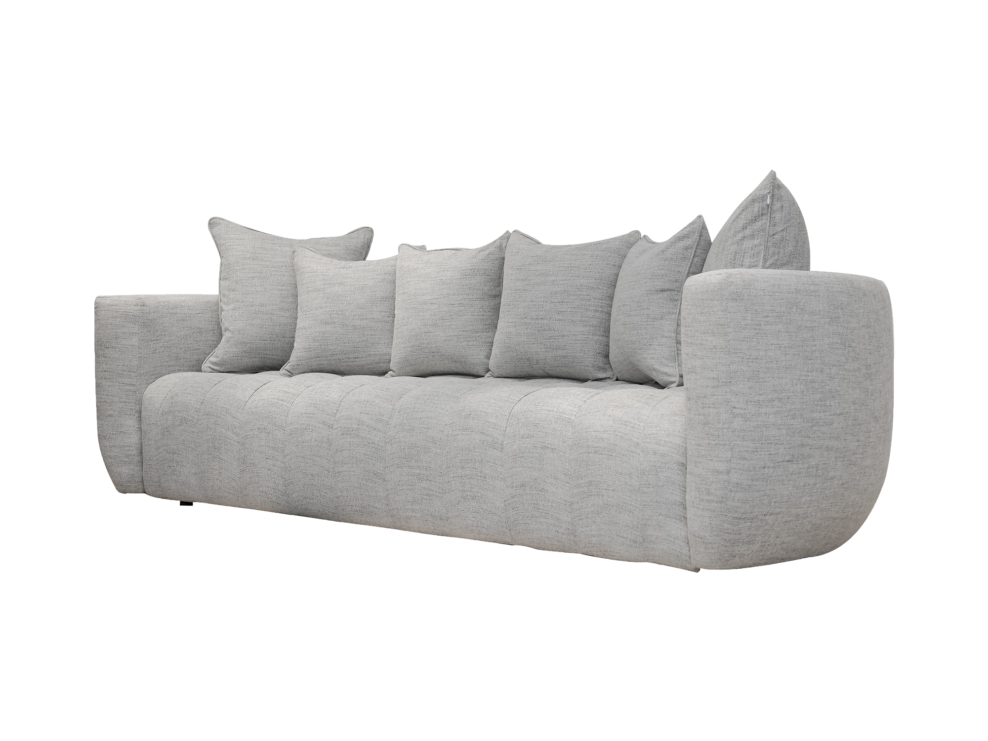 Sofa features a low–profile silhouette with track armrests and deep seating complemented by deep tufted stitching. The plush upholstery is covered in the decatur pebble fabric that gives the touches of casual, minimalist, and natural to the look but still comfortable for lounging. Its inset legs make this sofa look like floating above the floor.