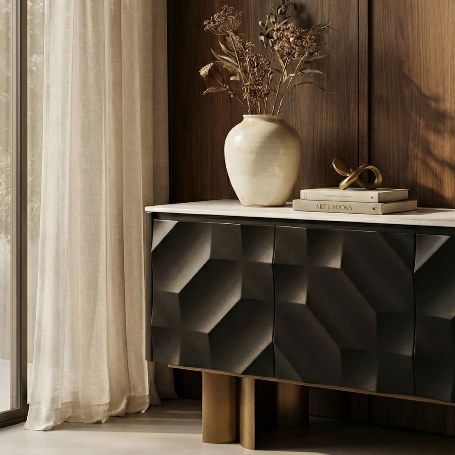 Channeling the essence of brutalist design, our Sculptor Sideboard stands as a testament to the fusion of robust aesthetics and masterful artisanship. The cabinetry displays chunky geometric shapes in a black tone, creating chic brutalism, while the stainless steel legs give this modern feature a touch of industrial flair.