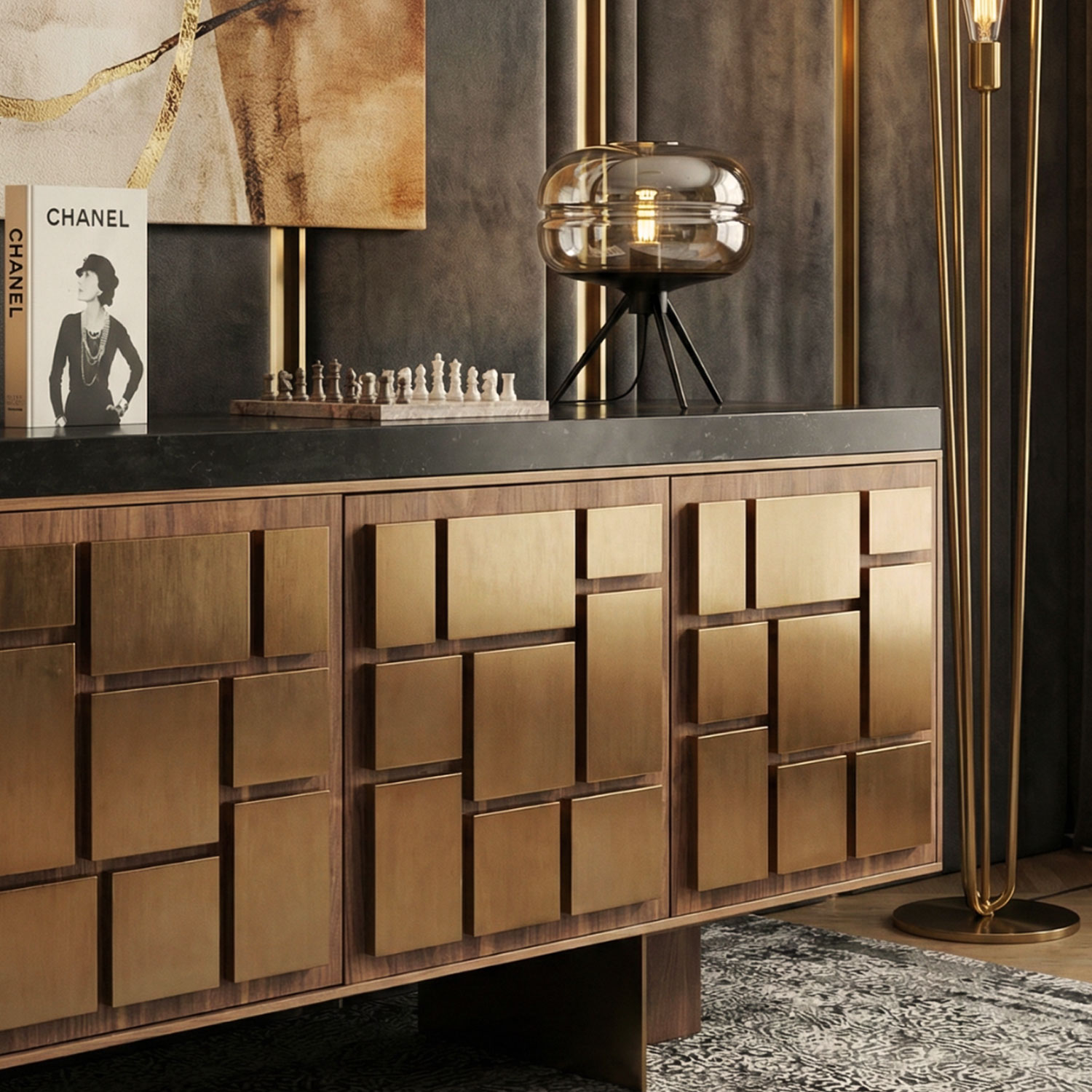 The Euclide sideboard features a sophisticated design, combining a luxurious marble tabletop with a sleek and durable finish. The base consists of metal structures covered with fine veneer marquetry, creating a blend of elegance and modernity. This table is an ideal choice for refined dining spaces, offering both style and functionality.