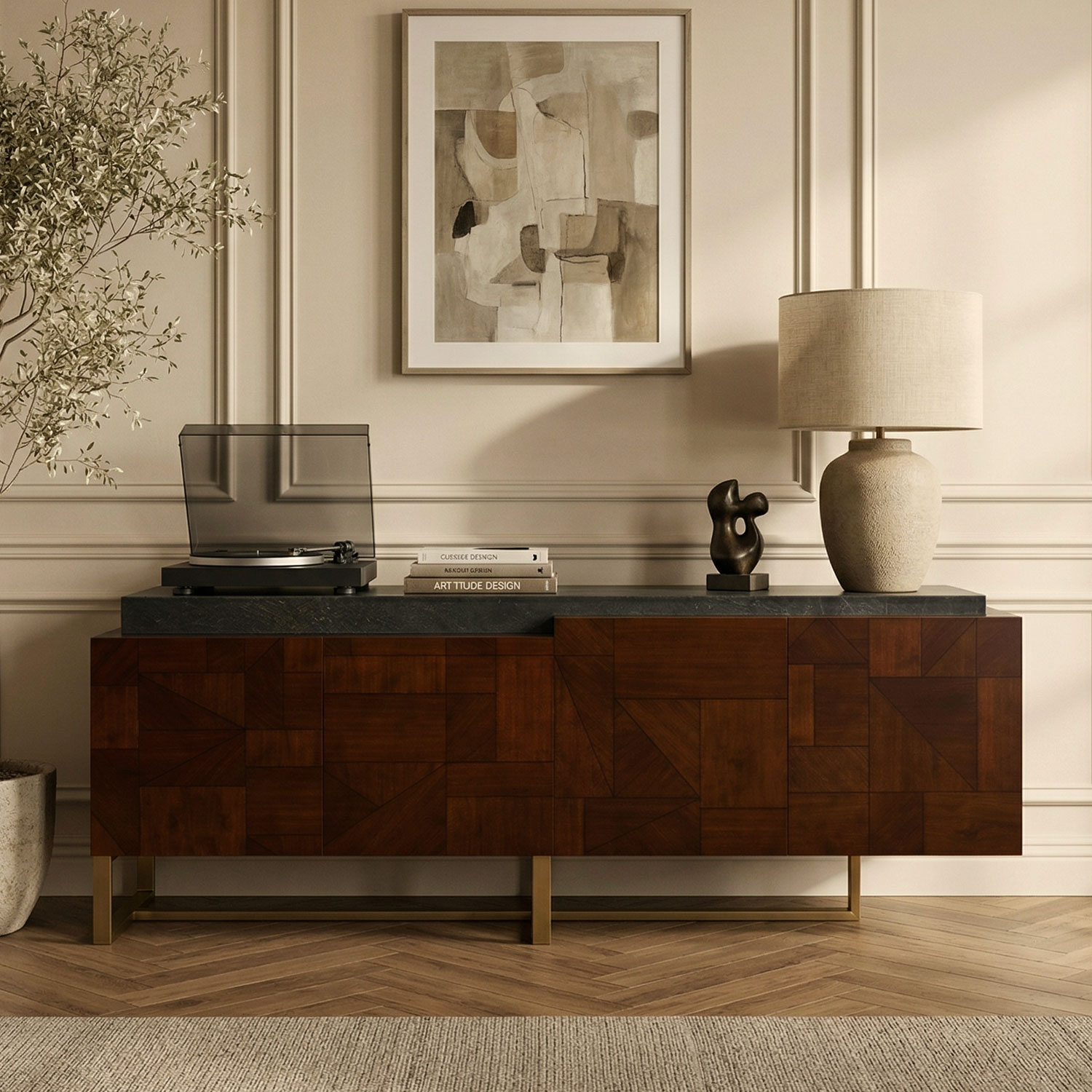 Our Centaur Sideboard showcases a sophisticated mixed-element design, resulting in a one-of-a-kind blend of form and function. This contemporary piece features a marble top panel, beautifully complemented by walnut-veneered surfaces. Geometric motifs are artfully inlaid into the walnut-veneered surface, adding a touch of eclectic style. Meanwhile, the lacquered gold metal base provides robust support to this marble-lous sideboard, giving it a glamorous appearance with a golden touch.